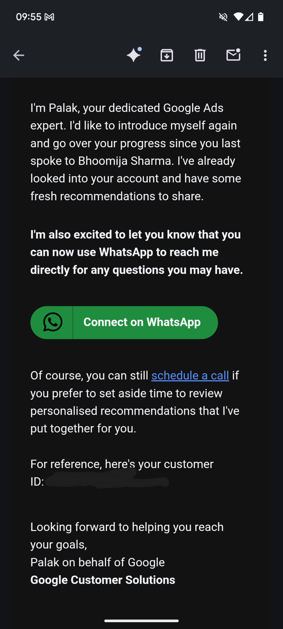 This week in the PPC Live WhatsApp group, Chris Ridley, Head of Paid Media at Evoluted, shared a screenshot of an email he received from a Google Ads representative. The message, sent by someone identifying themselves as “Palak,” informed Chris that he can now use WhatsApp to directly message his Google Ads rep for support and questions.
