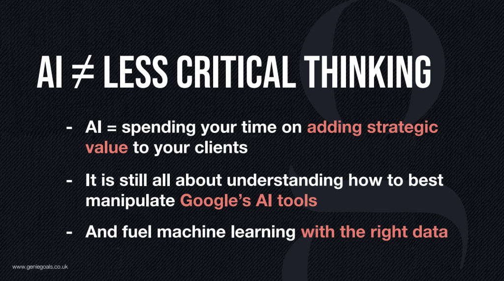 He emphasizes the need for strategic value in campaigns, pointing out that merely using AI tools like PMax isn’t enough for competitive advantage.