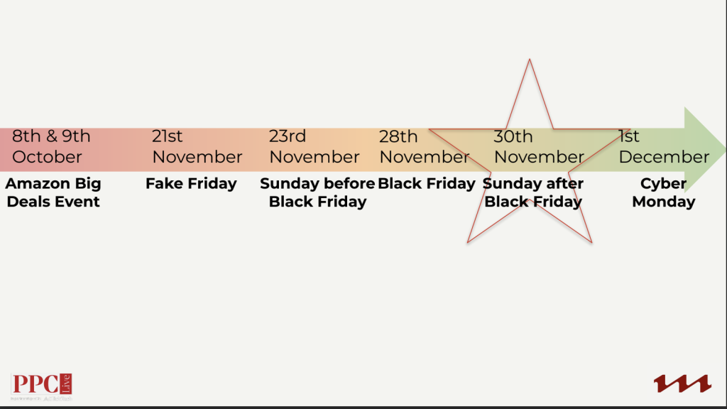 Several timelines for key dates like Fake Friday, Black Friday, and Cyber Monday are discussed, with strategic insights about ad scheduling, audience targeting, and performance evaluation.
