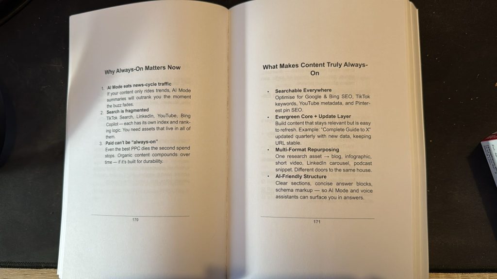 - SEO as the backbone – Stop chasing rankings like it’s 2009. Authority, trust signals, and whether LLMs surface your content – that’s the game.